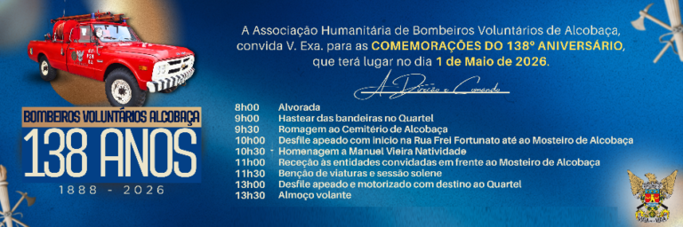 As comemorações do 138.º dos Bombeiros Voluntários de Alcobaça vão acontecer no dia 1 de Maio. A Direção e o Comando da Associação desta Instituição, momento de grande significado para todos aqueles que, ao longo dos anos, têm contribuído para