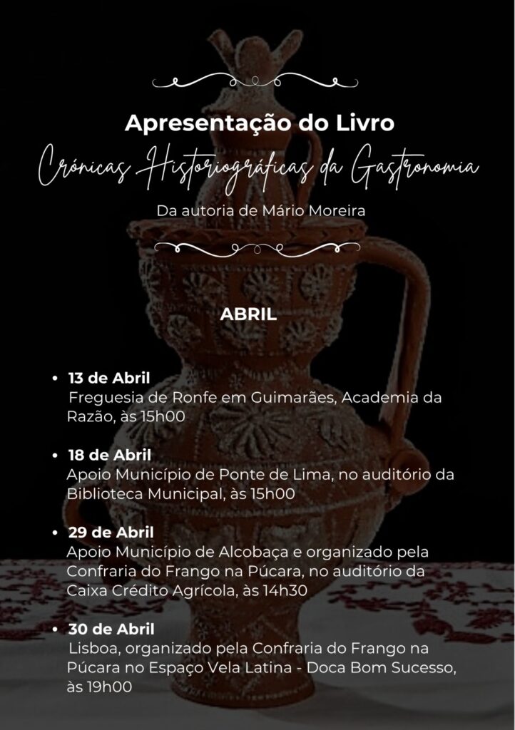 A Chancelaria da Confraria do Frango na Púcara apresenta hoje o livro “Crónicas Historiográficas de Gastronomia”, da autoria do chef Mário Moreira, no auditório da Caixa de Crédito Agrícola Mútuo de Alcobaça, pelas 14:30 horas do dia 29 de abril (quarta-feira).