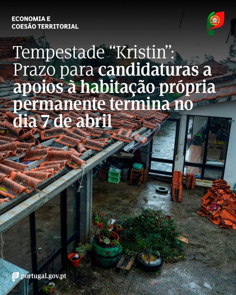 O prazo para as candidaturas aos apoios referentes às habitações próprias permanentes, afetadas pela tempestade “Kristin”, termina no dia 7 de abril.